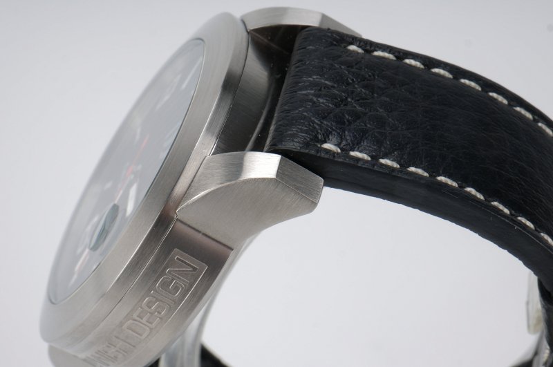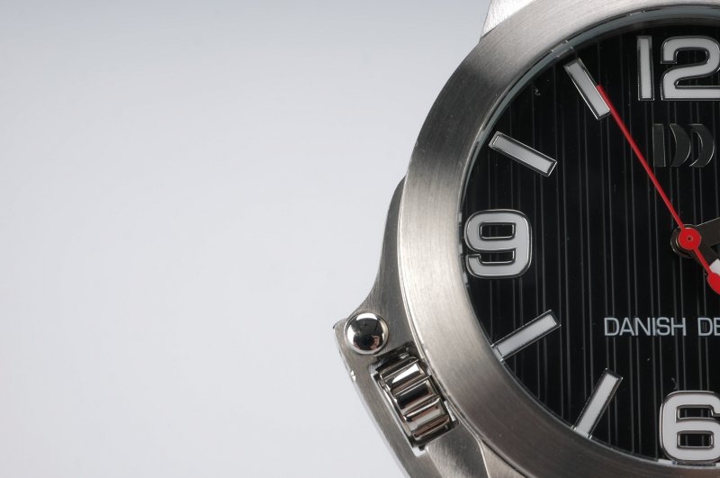 - Urskiven er sort med hvide tal og linjer. Rød sekundviser og hvid minut- og timeviser.