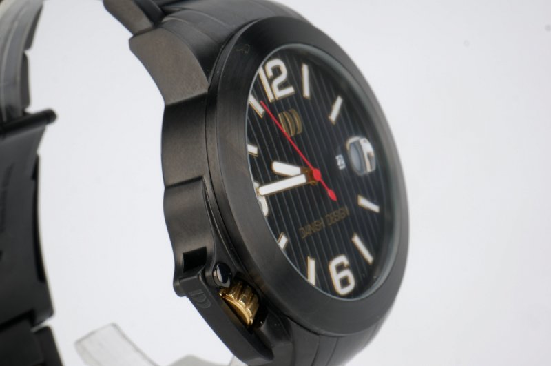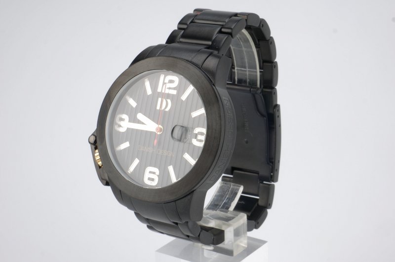 - Urskiven er sort med hvide tal og linjer. Rød sekundviser og hvid minut- og timeviser.