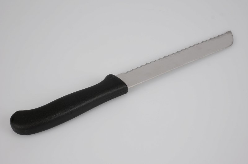 Med en ca. 21 cm lang, takket kantet og stemplet blad, er dette værktøj specielt designet til at gøre det nemt og præcist at skære brød med venstre hånd.